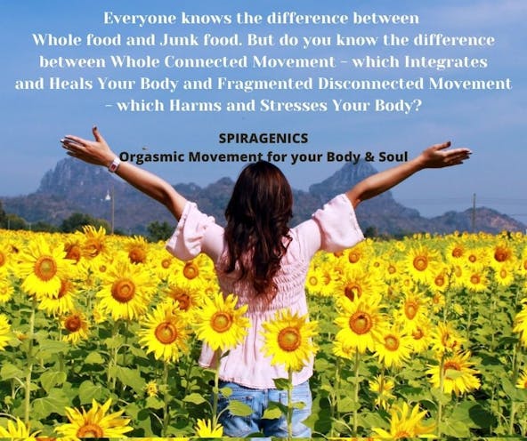 Spiragenics “works” because it encourage greater sensitivity and awareness for you to move and exercise in harmony with your Whole Being and the Whole Movement of Life. This new movement foundation for life, health and ease is what actually sets Spiragenics apart from all other movement and exercise systems still based on the old paradigm of “More Pain = More Gain.” Most of us are unaware of this invisible way of movement, because it has been hidden through years of movement and postural misuse, bad habits and stress. This is why every time you stand, sit, walk, stretch, exercise or do yoga, without the right movement foundation you are unknowingly creating stress, pain and harming your body. Spiragenics “Spiral Movement” provides your body with the movement nutrition your body is constantly craving but hardly ever receives due to the imposition of faulty movement programs and a movement virus that slowly erodes the life giving nourishment and support of your organic and orgasmic spontaneous movement potential.